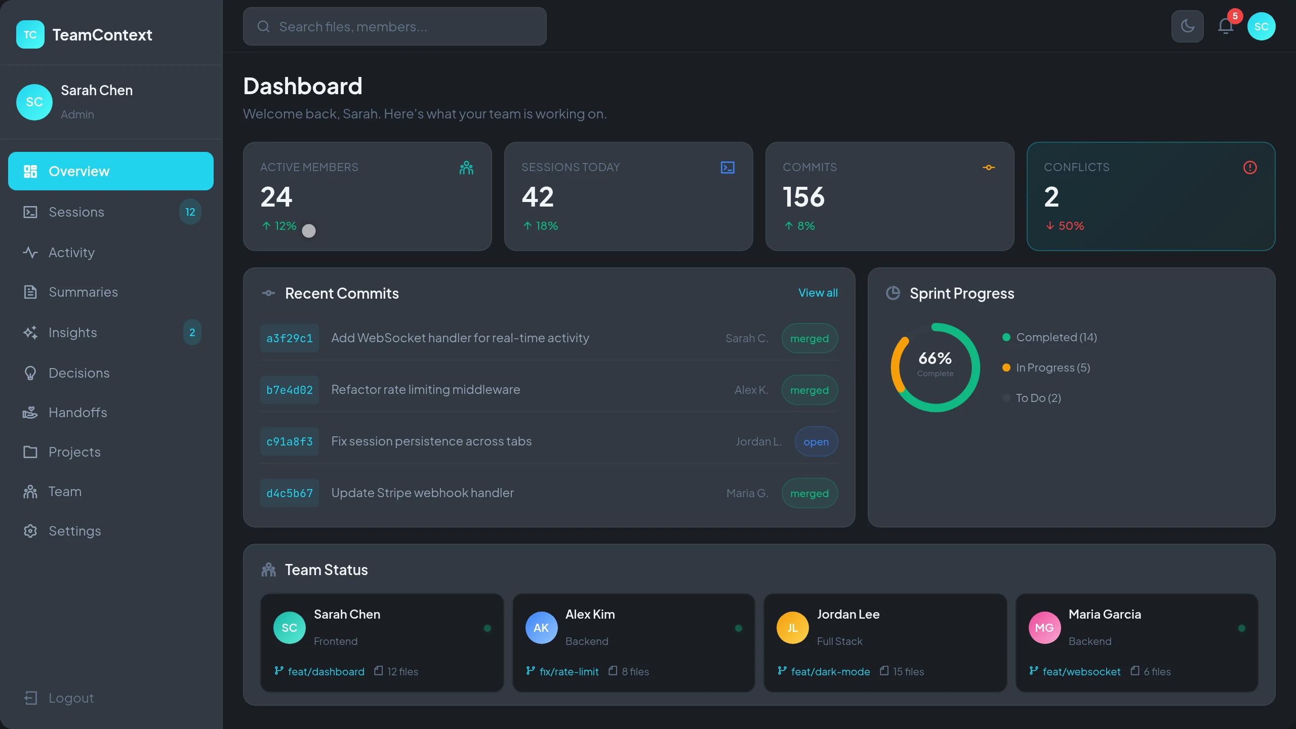 Open your dashboard to see what everyone's building. AI summaries, conflict alerts, and smart handoffs — all in real-time.